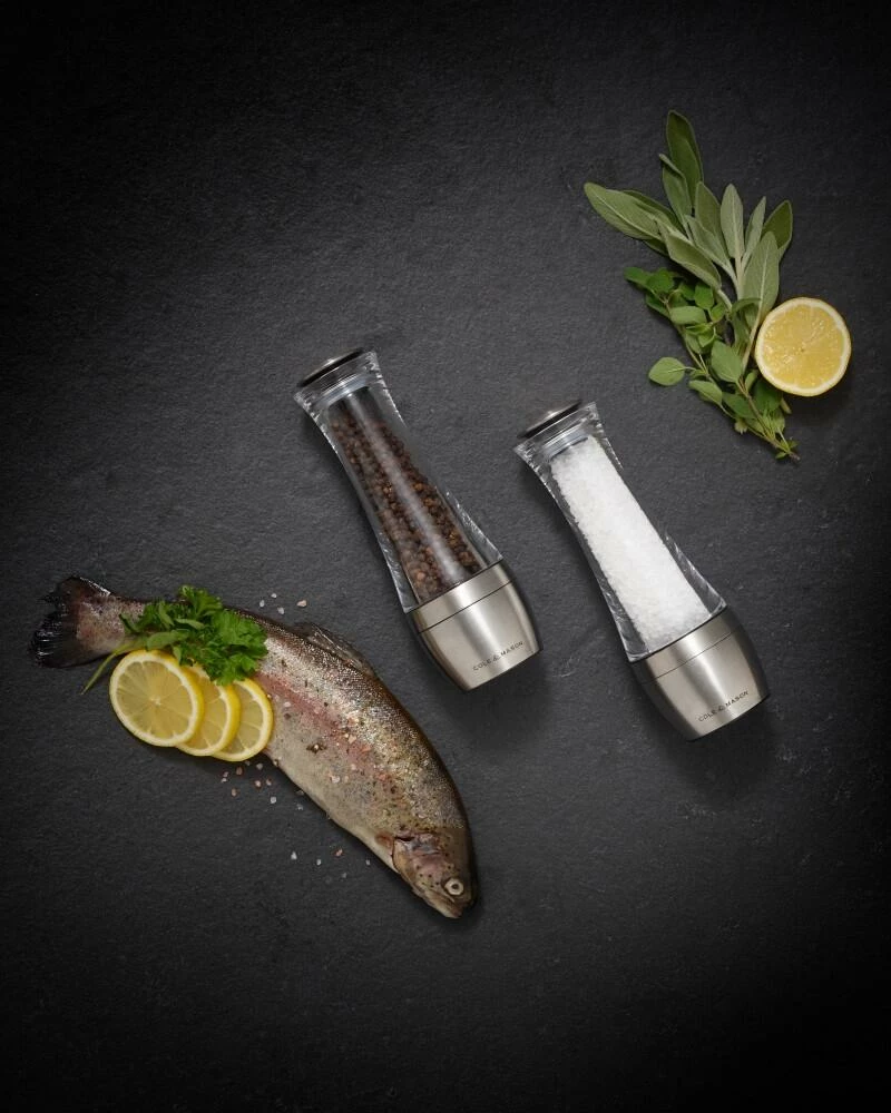 Die formschönen Präzisionsmühlen von Cole & Mason haben einen schlanken Acrylkörper und einen Edelstahl-Fuß. Das Besondere an der Mühle ist, dass sich das Mahlwerk im Fuß der Mühle befindet. Über diesen lässt sich die Mahlstärke einstellen und zugleich mahlt der Drehmechanismus im Fuß reibungslos. Die Pfeffermühle besitzt einen widerstandsfähiger Mahl-Mechanismus aus Karbonstahl, der die Pfefferkörner nicht zerdrückt, sondern klein abreibt. Die Salzmühle hat einen widerstandsfähigen Keramik-Mechanismus. Die Reduzierung der Mittelachse verleiht der Mühle ihr offenes, ansprechendes Design und macht das Befüllen besonders einfach.