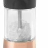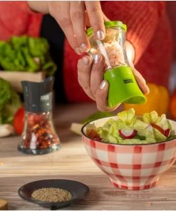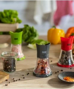 Dank des Mini-Designs passt die Gewürzmühle sowohl auf die Arbeitsplatte als auch auf den Esstisch. Mahlt Salz, Pfefferkörner, getrocknete Kräuter und Flachssamen im Handumdrehen. Das Überkopfdesign hält die Arbeitsfläche sauber.