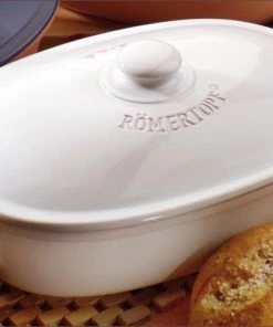 Römertopf Brot-Frische-Topf oval weiß, medium. Brottopf zum Aufbewahren und Frischhalten von Brot und Brötchen über viele Tage. Atmungsaktiver Naturton und 3 Löcher an jeder Seite sorgen für die notwendige Luftzirkulation.