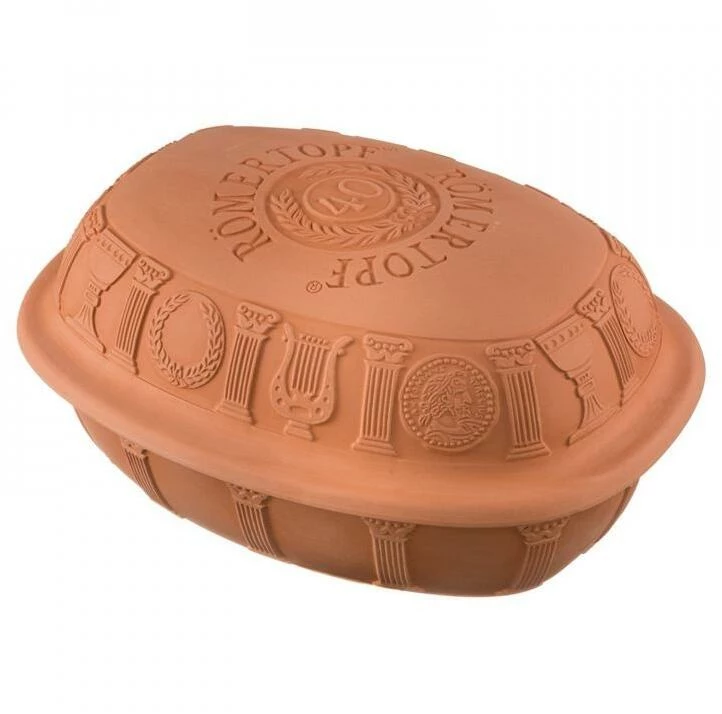 Mit dem Jubiläums-Römertopf bietet Römertopf einen Bräter in neuer Größe und in neuem Design. Mit seinem Fassungsvermögen von 3,5 Kilogramm ist er die richtige Wahl, wenn 4 – 6 Personen bewirtet werden sollen. Ein Novum bei einem Römertopf dieser Größe: Der Deckel überragt die Unterschale rundum und lässt sich auf diese Weise sowohl der Breite als auch der Länge nach beidhändig greifen – ein echtes Plus für eine bequeme Handhabung. Optisch erinnert der Jubiläumsbräter mit der Jahreszahl 40 und Lorbeerkranz an die römische Tradition des Kochens in Tongefäßen, die 2000 Jahre später durch den Römertopf wieder belebt wurde. Heute ist die Marke RÖMERTOPF® ein weltweit eingetragenes Warenzeichen und wird auf allen Kontinenten verwendet.