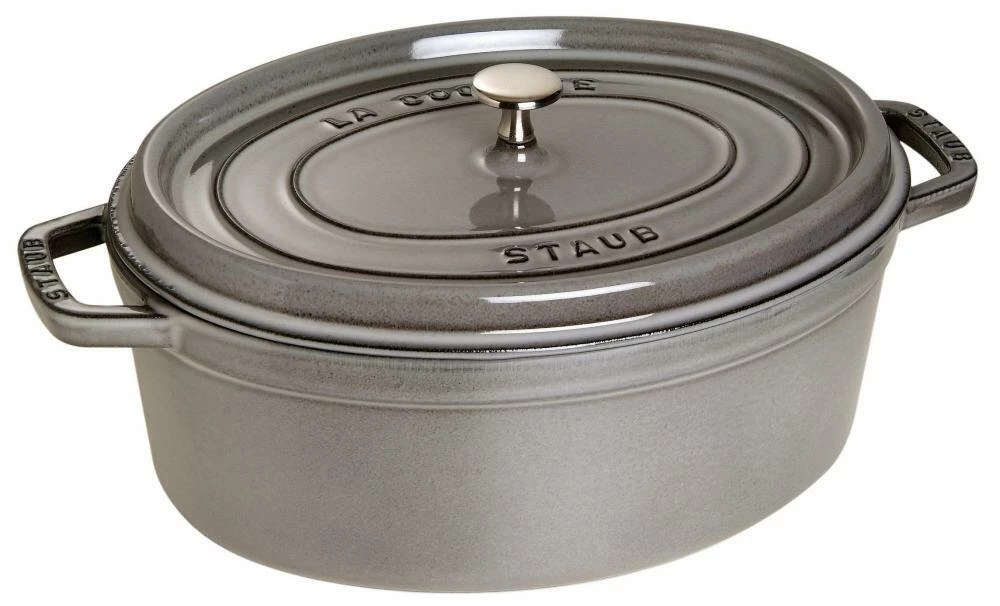 Eigenschaften des Staub Bräter bzw. Cocotte oval aus Gusseisen in graphitgrau: