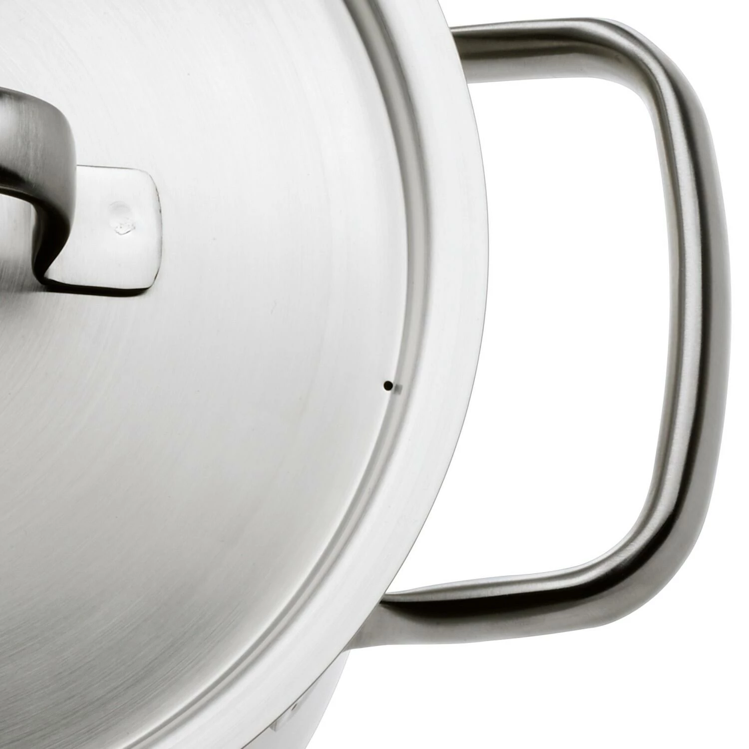 Dank seines stabilen und unverwüstlichen Materials aus Cromargan® Edelstahl, steht der Topf fest auf jedem Herd, auch Induktion und ist beständig gegen Speisesäuren sowie geruchs- und geschmacksneutral. Der TransTherm® Allherdboden nimmt die Hitze schnell auf, verteilt sie gleichmäßig und speichert sie lange in seinem Inneren. Die stabilen, innen hohlen Griffe liegen gut in der Hand. Somit werden die Griffe beim Kochen nicht heiß. Der schwere Aufliegedeckel verschließt sicher den Topf, lässt sich bei Bedarf aber auch schnell zur Seite schieben. Zusätzlich sorgt die integrierte Dampföffnung im Deckel für einen kontrollierten Dampfabzug und mit der Innenskalierung lassen sich Flüssigkeiten passgenau in den Topf einfüllen. Durch den breiten Schüttrand lassen sich Flüssigkeiten tropfrei wieder ausgießen.