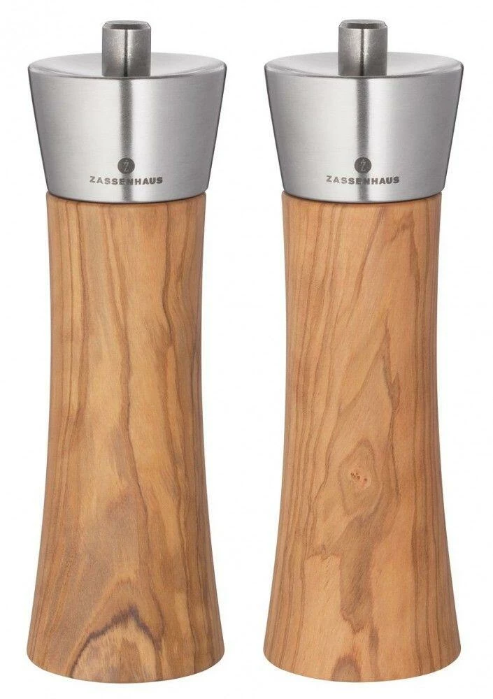 Zassenhaus Geschenkset Augsburg Olive. Bestehend aus Salzmühle und Pfeffermühle der Serie Augsburg mit 18 cm Höhe. Aus Olivenholz.