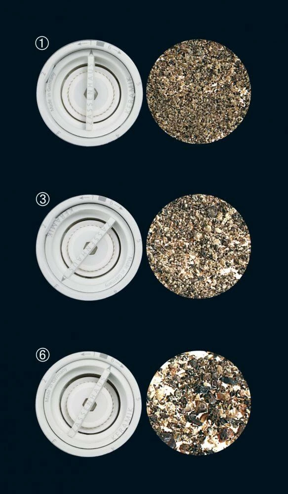 - es ist 6-fach einstellbar, von pulverfein (1) bis grob gemörsert (6)